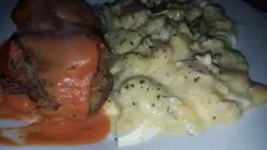 Paprikasoße mit Hackfleisch für Paprikaschoten geteilt, gefüllt mit Hackfleisch, Pizzakäse und Petersilie...
